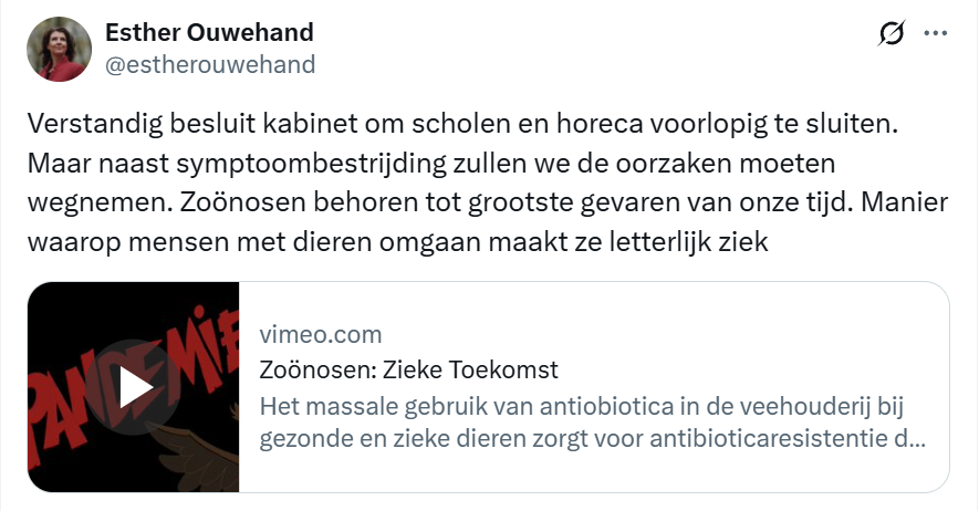 Hoe is het mogelijk dat een politieke partij de ruimte krijgt om te profiteren van andermans ellende en verdriet, dat ze geen situatie onbenut laten om hun vijanden te demoniseren zonder teruggefloten te worden. Dat ze maatschappelijke onrust mogen creëren en mensen tegen elkaar mogen opstoken om hun eigen politieke boodschap te laten horen, het is schaamteloos. Waarin ze aangaf dat er niet alleen aan symptoombestrijding gedaan moest worden maar ook de oorzaken weggenomen moesten worden. Daarna gaat ze over op dat zoönose het grootste gevaar van deze tijd is en dat de manier waarop mensen met dieren omgaan mensen letterlijk ziek maken. Alsof dat nog niet genoeg is heeft ze er een video bijgeplaatst met de titel: Zoönose Zieke Toekomst en vervolgens een stuk over hoe het massale gebruik van antibiotica in de veehouderij bij gezonde en zieken dieren zorgt voor resistentie.