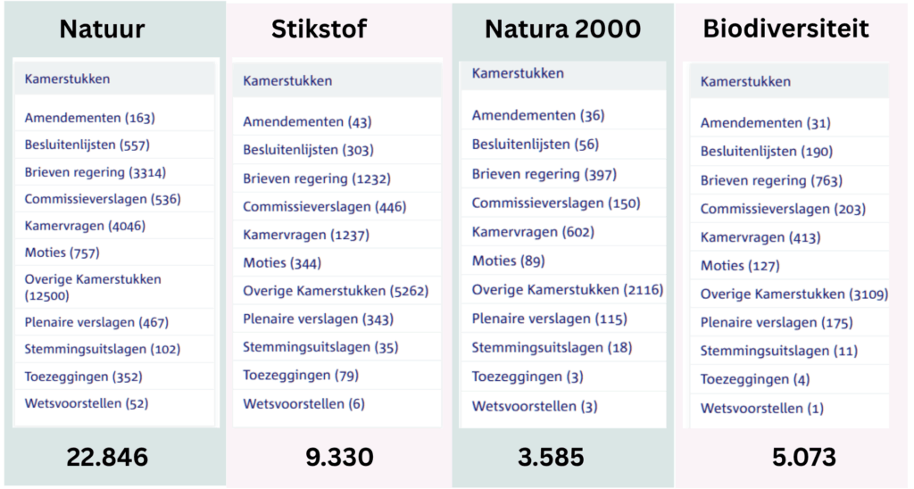 Sinds 2020 zijn er ruim 40.834 Kamerstukken verschenen over de natuur. VEERTIGDUIZEND officiële documenten, elk gemiddeld vast tien pagina’s dik. Dat is zo’n 620.000 vellen papier, nog zonder de versies, notities, bijlagen, printers die vastliepen en de kopieën voor tweehonderd Kamerleden, ministeries en adviesraden. Tel daar de inkt, distributie en digitale opslag bij op, en het natuurbeleid zelf is inmiddels verantwoordelijk voor een bos aan CO₂-uitstoot.